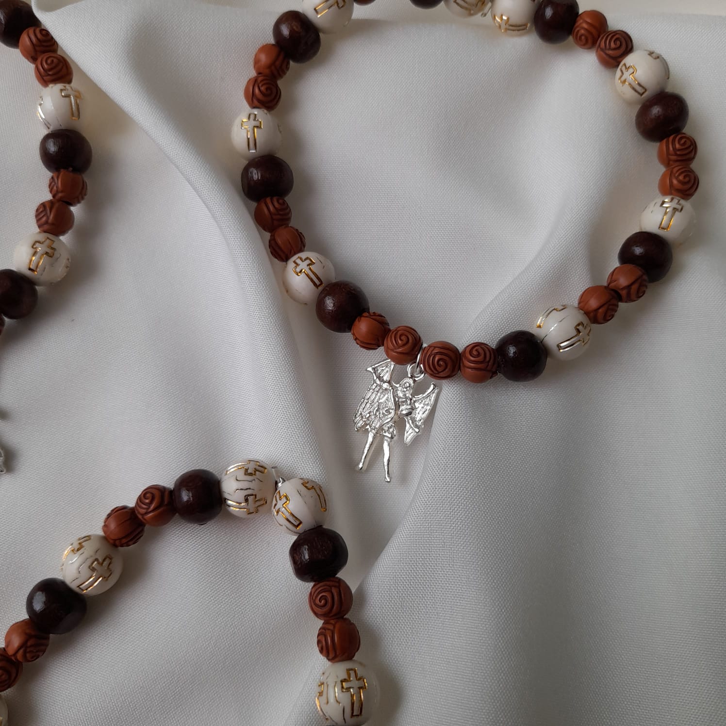 Pulsera de elástico con cuentas de plástico variadas y dije de San Miguel Arcángel